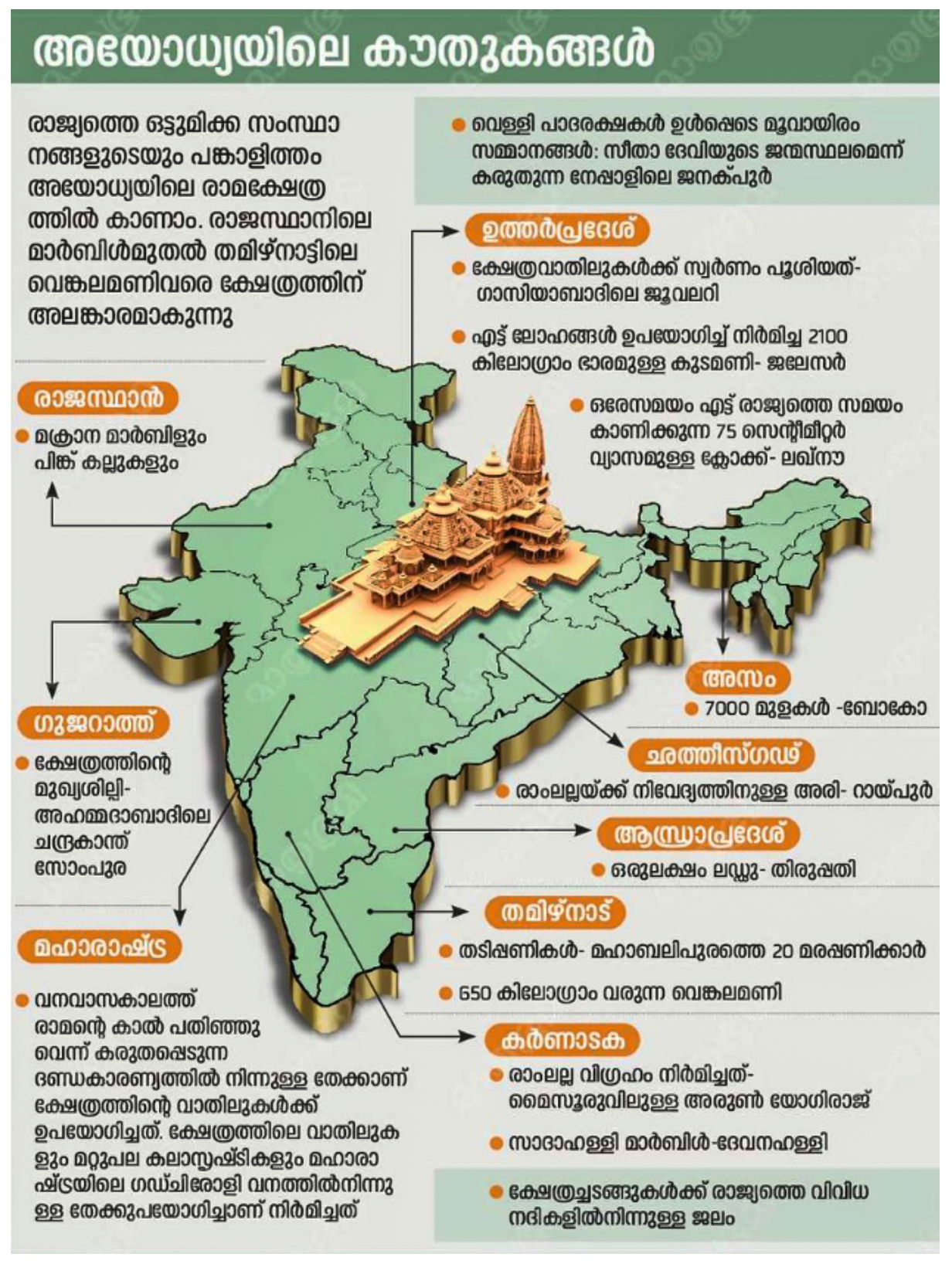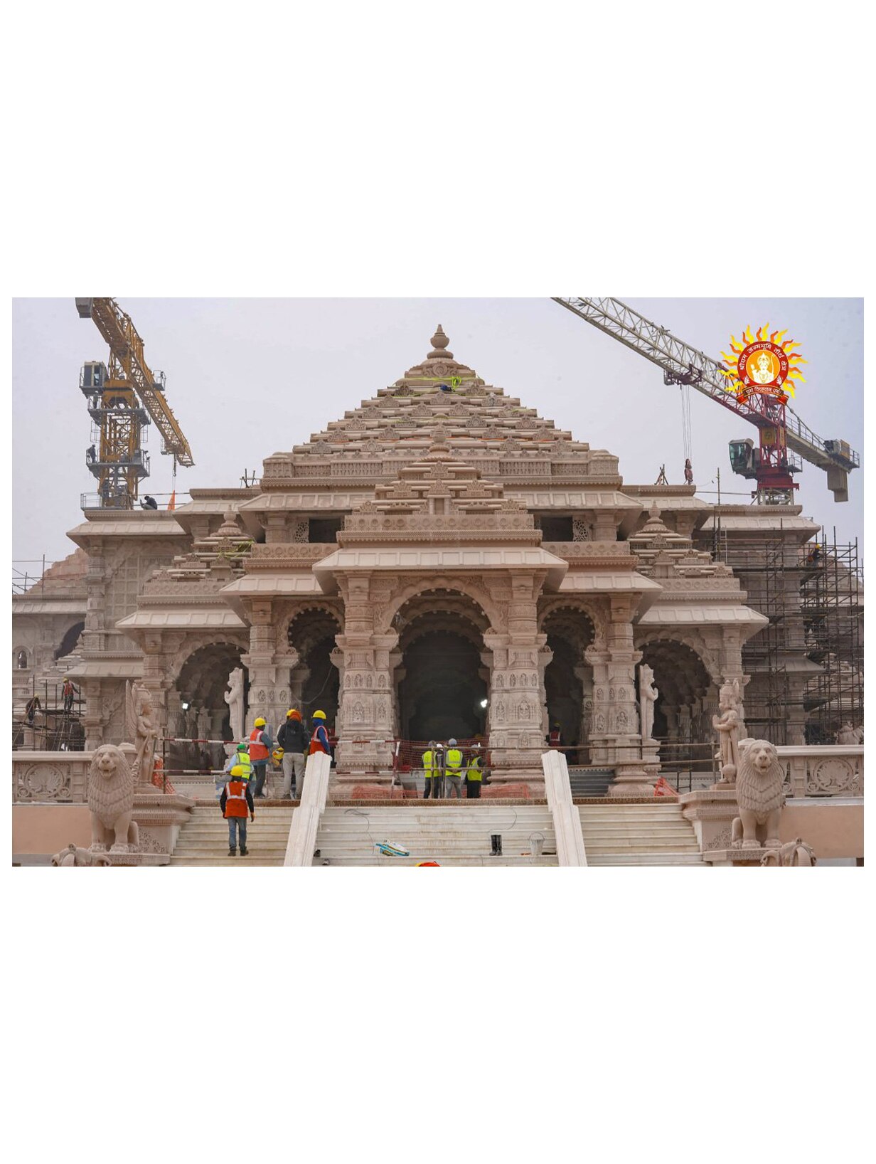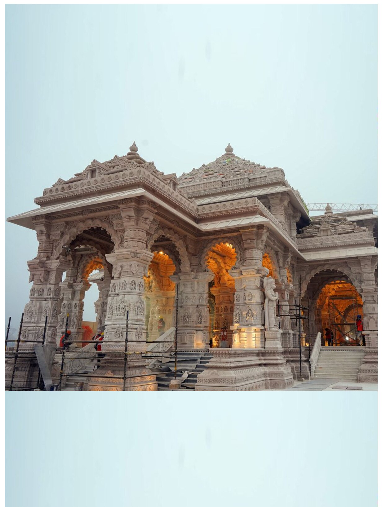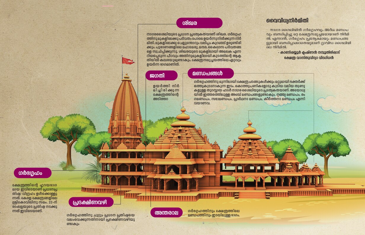 വിശ്വാസങ്ങള് തീര്ത്ത അടിത്തറയില്, ഉത്തര-ദക്ഷിണ ക്ഷേത്ര വാസ്തുശില്പ ശൈലികളും രാജ്യത്തിന്റെ എന്ജിനീയറിങ് വൈദഗ്ധ്യവും കൈകോര്ക്കുന്ന വാസ്തുവിദ്യാ വൈഭവമാണ് അയോധ്യയിലെ എഴുപത് ഏക്കറില് ഒരുങ്ങിയിരിക്കുന്ന രാമക്ഷേത്രം. ഉത്തരേന്ത്യയിലെ ക്ഷേത്ര നിര്മാണത്തിനുപയോഗിക്കുന്ന നാഗര ശൈലിയും ദക്ഷിണേന്ത്യയുടെ ദ്രാവിഡ ശൈലിയും ക്ഷേത്രസമുച്ചയത്തില് ഒരുമിക്കുമ്പോള്, കേരളത്തിന്റെ തേക്കും രാജസ്ഥാനിലെ പിങ്ക് നിറമുള്ള കല്ലുകളും തെലങ്കാനയുടെയും കര്ണാടകയുടെയും ഗ്രാനൈറ്റും അതില് പങ്കുചേരുന്നു. നാലായിരത്തോളം പേരുടെ രാപ്പകലില്ലാത്ത അധ്വാനമാണ് രാമക്ഷേത്രത്തിനു പിന്നില്. നിര്മാണം തുടങ്ങി നാലുവര്ഷം പൂര്ത്തിയാകുന്നതിന് മുമ്പ് ക്ഷേത്ര നിര്മാണത്തിന്റെ ആദ്യഘട്ടം പൂര്ത്തിയായിരിക്കുകയാണ്. ജനുവരി 22-ന് ക്ഷേത്രത്തിന്റെ പ്രതിഷ്ഠാ കര്മം നടക്കുകയാണ്.